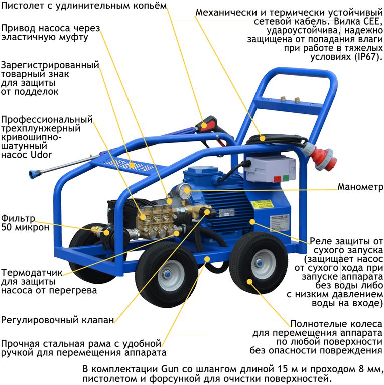 АВД ПОСЕЙДОН (электро 11кВт, 4 колеса, насос UDOR (Италия) 350бар, 17л/мин, шланг прох. 8мм х 15м, пистолет, 1 форс.для поверхностей)