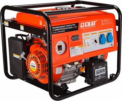 Скат УГБ-4000Е — это портативный бензиновый генератор с электрическим запуском, имеет номинальную мощность 4 кВт при мощности двигателя 4,9 кВт. Вес данной установки составляет всего 87,4 кг.