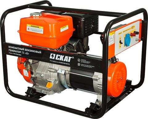 Бензиновый генератор Скат УГБ-7500 basic — это упрощенная версия данной торговой марки, имеет номинальную мощность 7,5 кВт при максимальной мощности двигателя 8,3 кВт. Вес данной установки составляет всего 79,6 кг.
