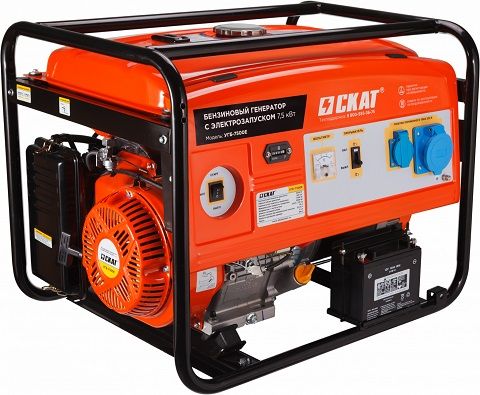 Скат УГБ-7500Е — это портативный бензиновый генератор с электрическим запуском, имеет номинальную мощность 7,5 кВт при мощности двигателя 9,25 кВт. Вес данной установки составляет всего 96 кг.