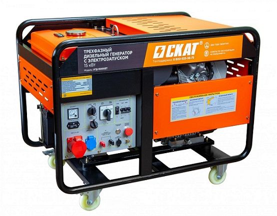 СКАТ УГД-15000ЕТ — это трёхфазный генератор на дизельном топливе мощностью 15 кВт с электрозапуском, системой предпускового подогрева и с возможностью подключения блока автоматического ввода резерва – АВР.