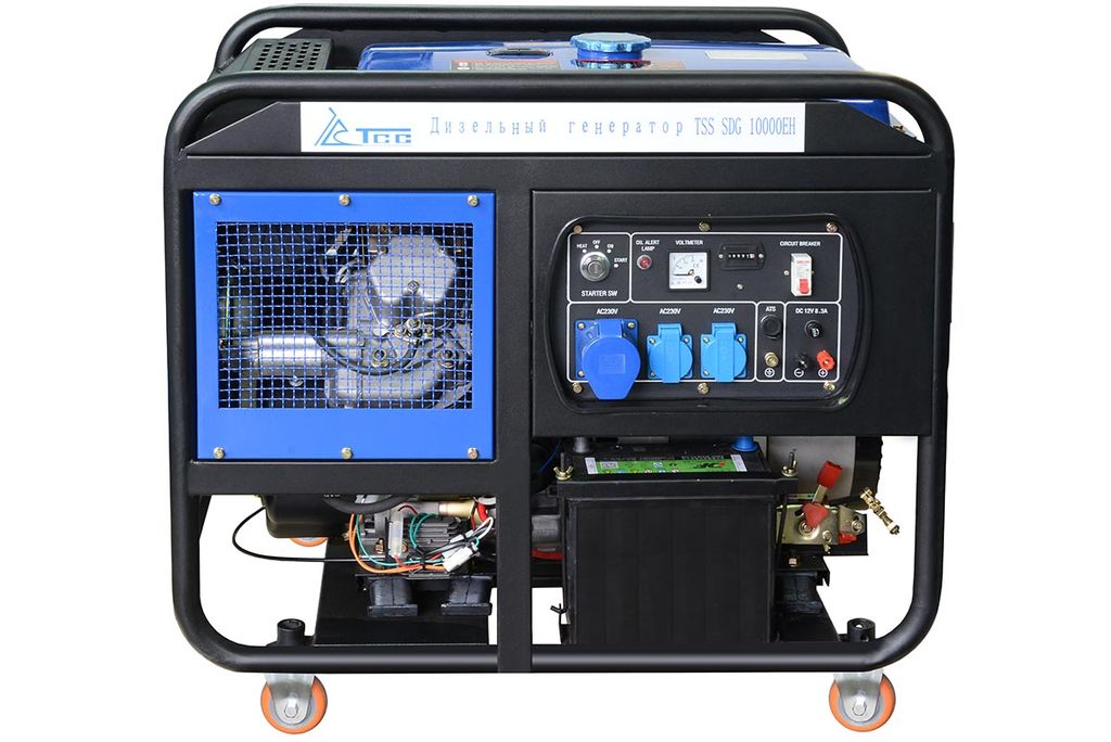 Дизельный генератор TSS SDG 10000EHA — это установка для выработки однофазного напряжения 220В с мощностью 10 кВт, способна кратковременно выдавать до 11 кВт (максимальная мощность). Имеет открытое исполнение на металлической раме, и электрический тип запуска. Характерной особенностью является наличие колес и ручек для транспортировки. SDG 10000EHA имеет не большие габаритные размеры (длина 870 мм, ширина 630 мм и высота 700 мм), а также облегченное по весу исполнение 195 кг.