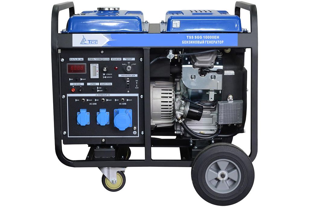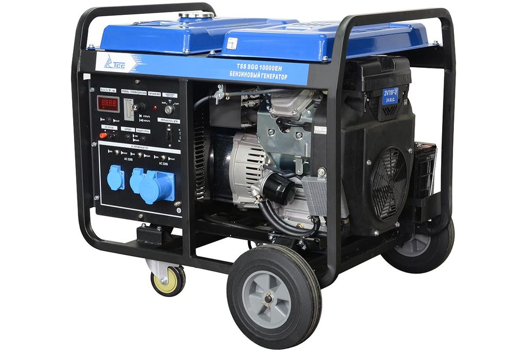 Бензогенератор TSS SGG 10000EH — это однофазное устройство, для выработки напряжения номинальной мощностью 10 кВт. Запуск производится электрическим стартером. В качестве топлива используется бензин. Размер топливного бака 27,5 литров, что при расходе в 4,9 л/час позволяет отработать агрегату до 6 часов без дозаправки. Имеет в своем арсенале комплект колес и ручки, которые делают транспортировку удобной.