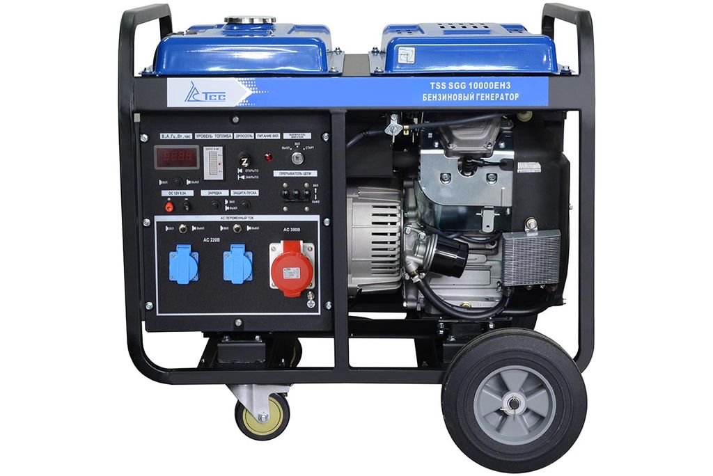 Бензогенератор TSS SGG 10000EH3 — это трёхфазное устройство, для выработки напряжения номинальной мощностью 10 кВт. Запуск электростанции производится электрическим стартером. В качестве топлива используется бензин. Размер топливного бака 27,5 литров, что при расходе в 4,9 л/час позволяет отработать агрегату до 6,5 часа без дозаправки. Имеет в своем арсенале комплект колес и ручки, которые делают транспортировку удобной.
